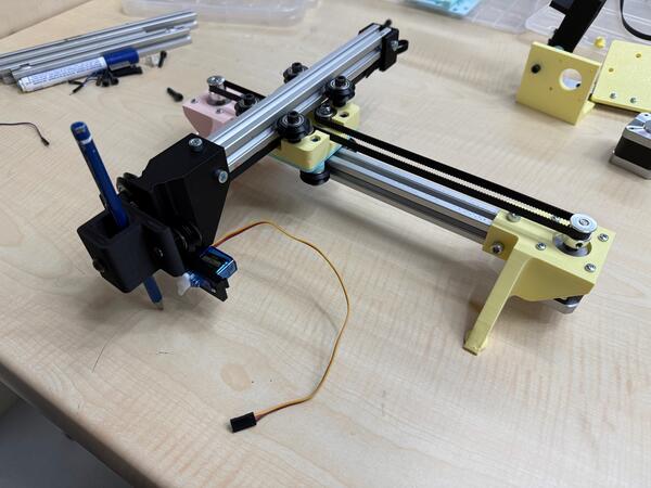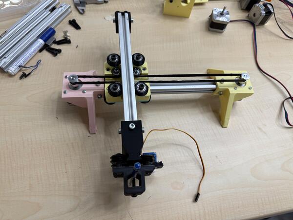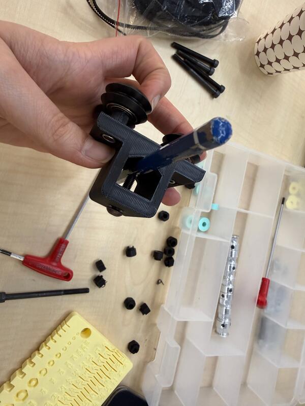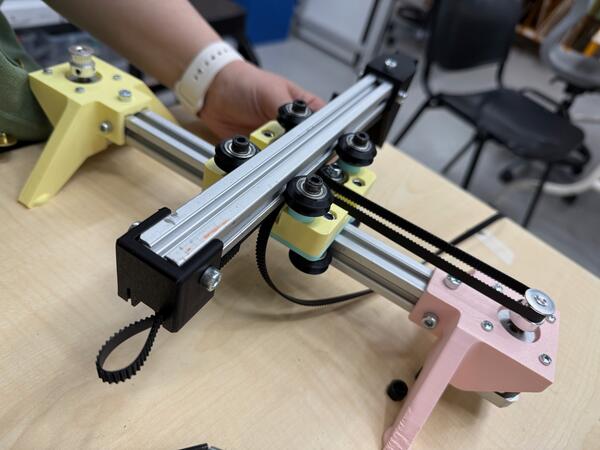 After adding the two stepper motors in place, we threaded the belt.